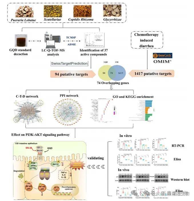 本研究先制备葛根芩连标准汤剂(GQD标准汤剂),采用LC-MS技术结合网络药理学分析其成分与机制,通过SN-38激活的NCM460细胞和CPT-11诱导的腹泻模型进行体外和体内实验,研究其抗炎活性与肠道屏障功能相关作用,验证关键蛋白和通路。