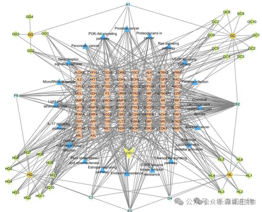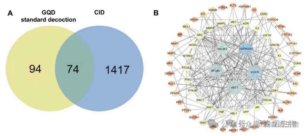 从130种成分中筛选出37种活性化合物,其相关的94个预测蛋白与疾病相关的1417个蛋白取交集,得到74个重叠蛋白。对这些蛋白进行分析,确定核心蛋白,同时GO和KEGG分析揭示了相关生物过程和通路。