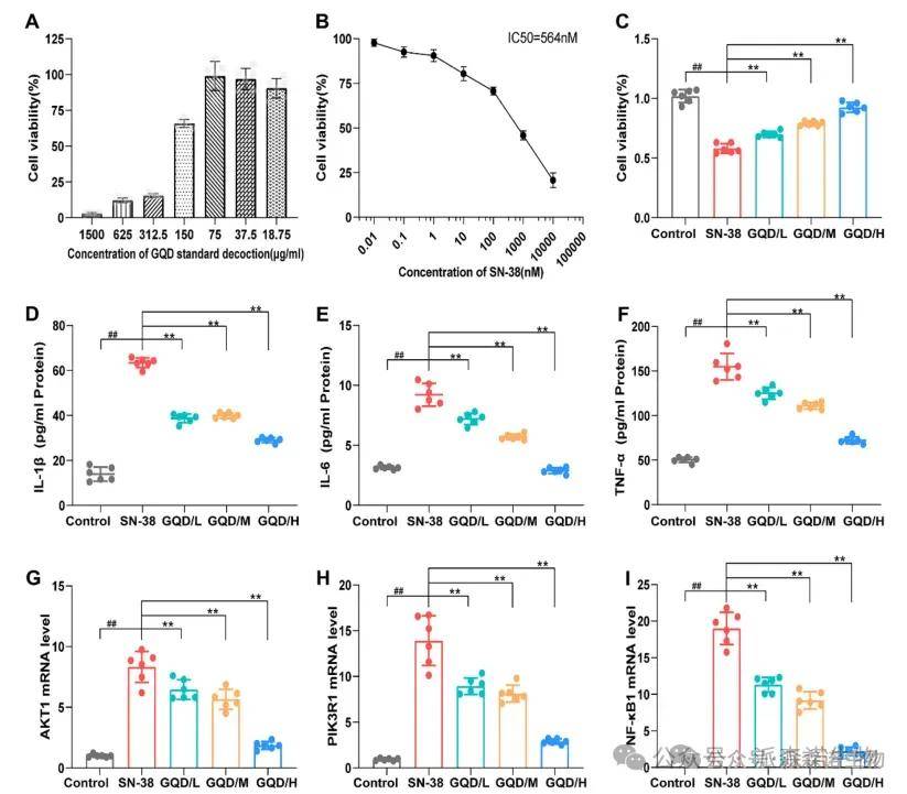 确定GQD标准汤剂在NCM460细胞中的无毒剂量,发现其可缓解SN - 38诱导的细胞损伤,提高细胞活力,降低细胞分泌的IL - 6、IL - 1β和TNF - α水平,且抑制PI3K/AKT/NF - κB通路相关蛋白的mRNA表达。