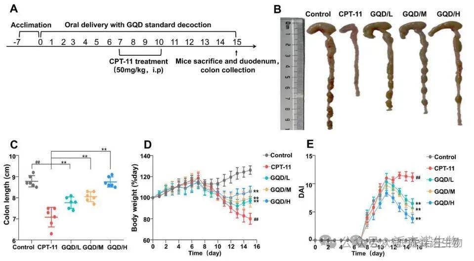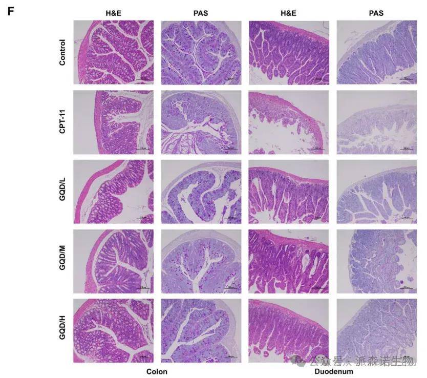 在体内实验中,GQD标准汤剂可减轻CPT - 11诱导的小鼠结肠缩短,改善体重和疾病活动指数(DAI),H&E和PAS染色显示其可保护肠道组织,减少炎症和维持黏液水平,同时增强紧密连接蛋白Occludin和ZO - 1的表达。