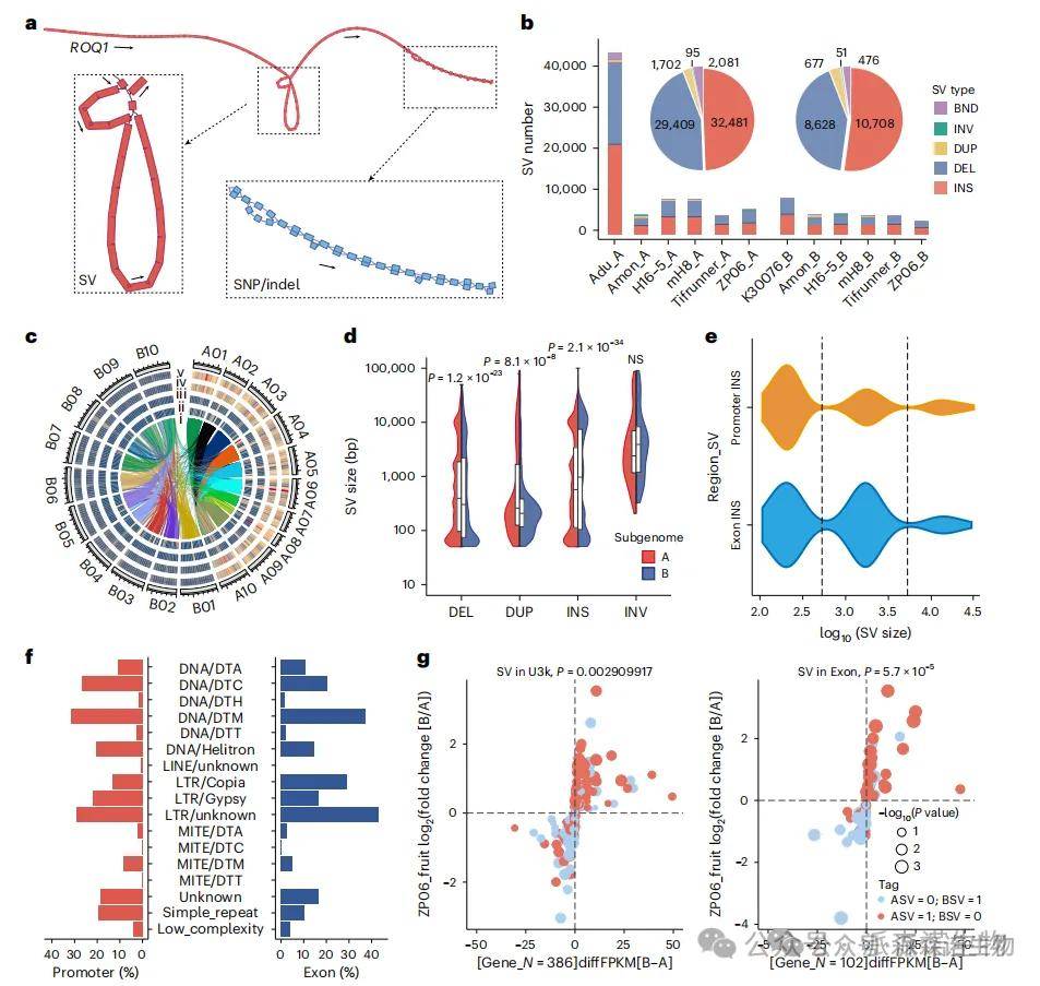 通过构建图谱型花生泛基因组,整合组装与比对两种SV检测方法,共识别出86,308个高置信度SV,主要为插入与缺失。其中10–16%的SV直接与基因重叠,15–30%位于启动子或下游3,000 bp区域。启动子和外显子区域中的SV更可能影响基因表达,最多有40%的插入/缺失来源于LTR或DNA转座子。以大荚材料ZP06为例,其A亚基因组包含2,130个插入和2,160个缺失,B亚基因组也发现大量结构变异。多个重要基因如Snakin-2、NAD+合成酶和糖基转移酶等的启动子或外显子中SV改变了其表达量或结构,如7.9 kb缺失、1.2 kb插入等,直接影响产量与抗性。