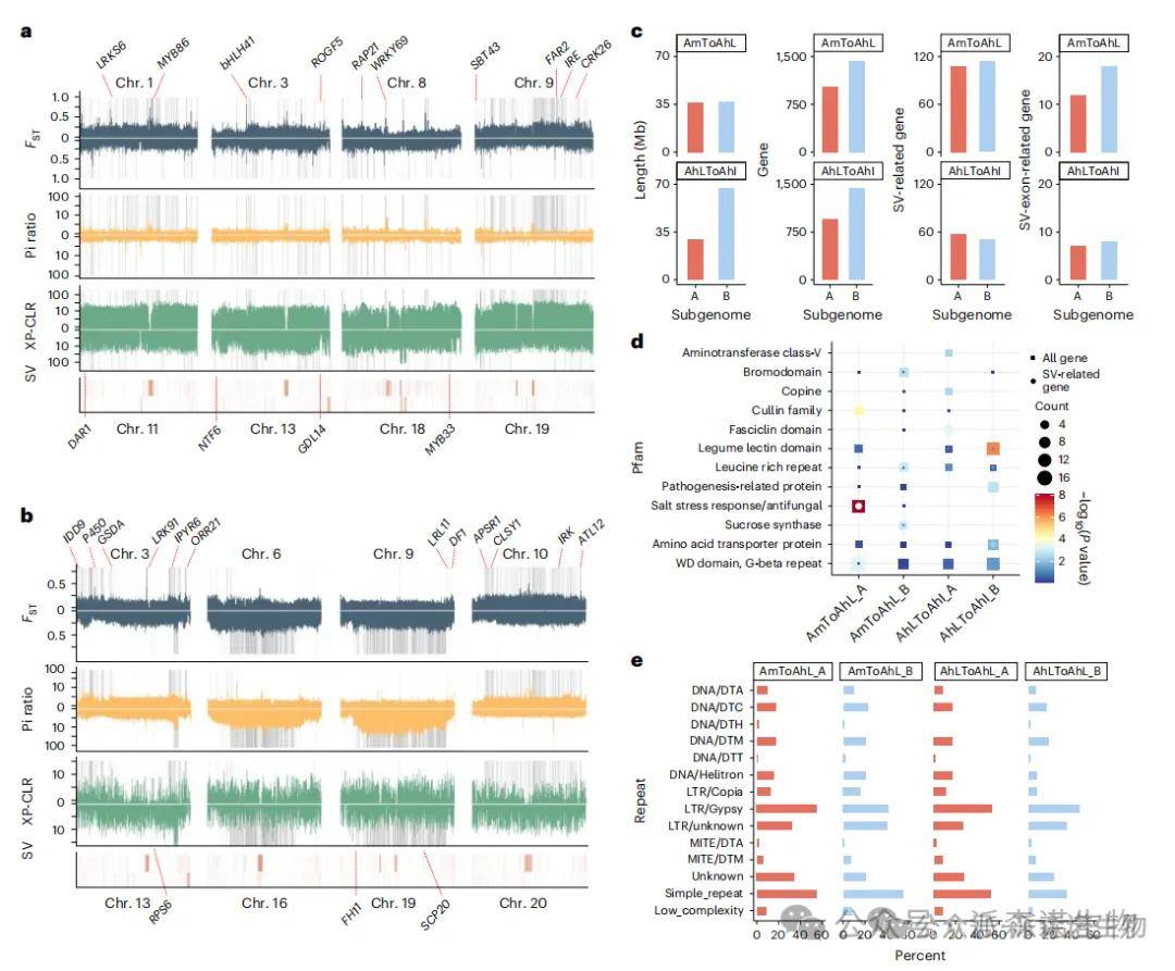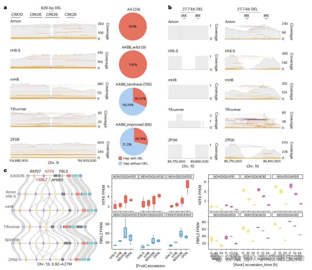 研究表明,结构变异(SVs)在花生驯化过程中对果实大小和抗病性状的形成起到了关键作用。在驯化相关SVs中,约41–55%与LTR或Gypsy重复元件重叠,35–55%与简单重复序列重叠,且B亚基因组的Helitron转座子比例显著低于A亚基因组,显示出明显的进化特征。19个SV相关基因与果实大小和抗病性状显著相关。例如,钙依赖性激酶CRK26在多个野生和二倍体品种中存在629 bp缺失,而亮氨酸重复基因IRK中有27.7 kb缺失,通过基因组组装得以准确识别。此外,荚果大小相关基因NTF6与抗病基因FBRL2构成花生中特有的串联单元,其高拷贝数变异与大荚果表型密切相关,且在抗病情境下表达同步下降。