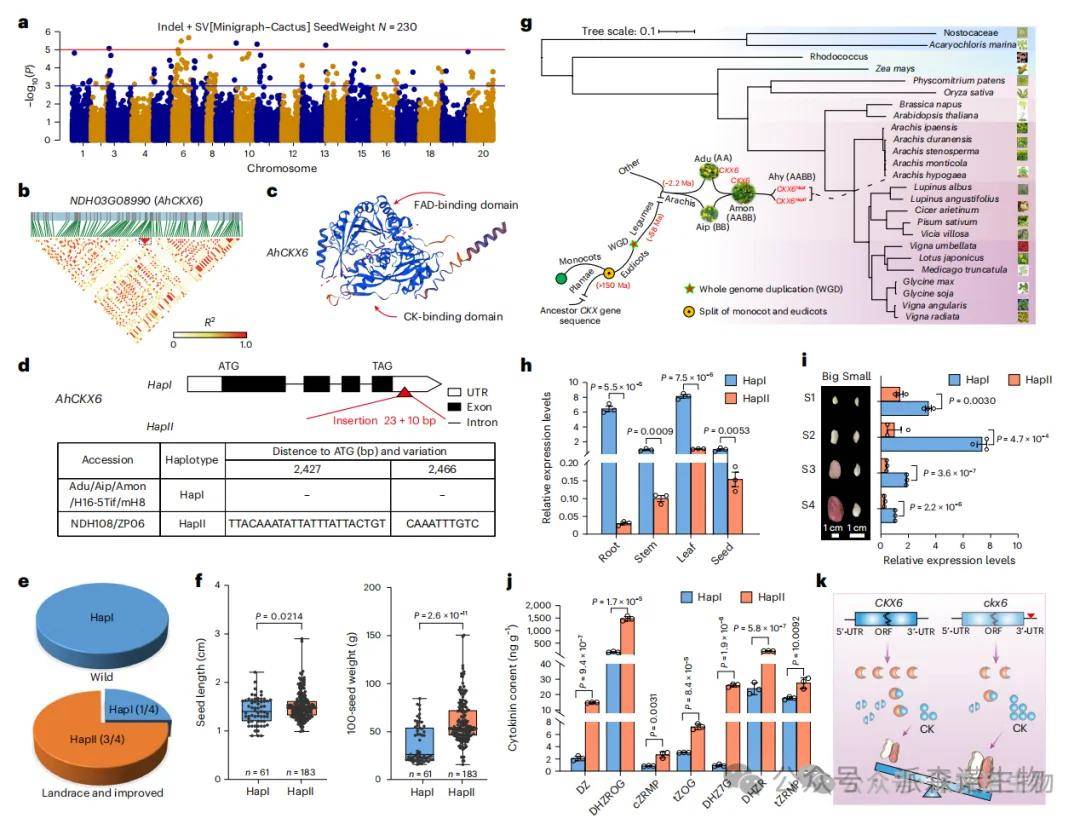 研究鉴定出117个与种子重量显著相关的SV或InDel,其中染色体3上一个SV(P = 1.84 × 10⁻⁴)显著与种子重量关联。该SV附近的AhCKX6基因在大粒品种中3′-UTR存在两个特异插入序列,75%的地方品种和改良品种携带该插入,而在61个野生品种中完全缺失。表达分析显示,小粒品种中AhCKX6表达显著高于大粒品种,而大粒品种的细胞分裂素含量更高。功能推断表明,这些插入降低CKX6表达,从而减少细胞分裂素降解,提升其积累水平,进而加快细胞分裂,促进种子发育。
