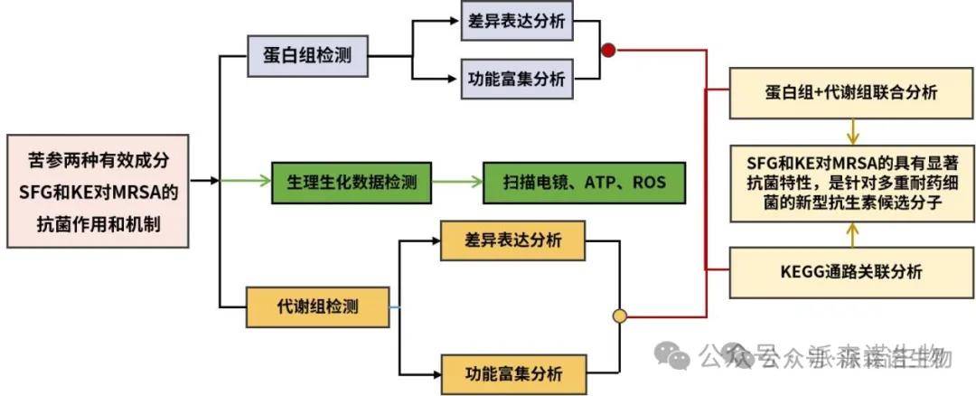 在我国,天然植物一直是药物的宝贵来源,比如短萼黄连可以治疗霍乱,青蒿素可以治疗疟疾,黄芩提取物可以杀灭沙门氏菌等,表明传统中药材有着巨大的基础医学研究潜力。巧妙链接传统中药材与现代医学基础研究,应用最新组学技术平台,主动瞄准具有明显临床意义课题,已成为当前研究热点。随着耐药细菌不断涌现并且迅速蔓延,由此产生了研发新型抗生素的迫切需求,而天然植物中可能含有多种抗菌成分,是发现新型抗生素的重要来源。本研究深入探讨苦参中两种黄酮类化合物对耐受甲氧西林的金黄色葡萄球菌(MRSA)的抗菌作用及相关机制。