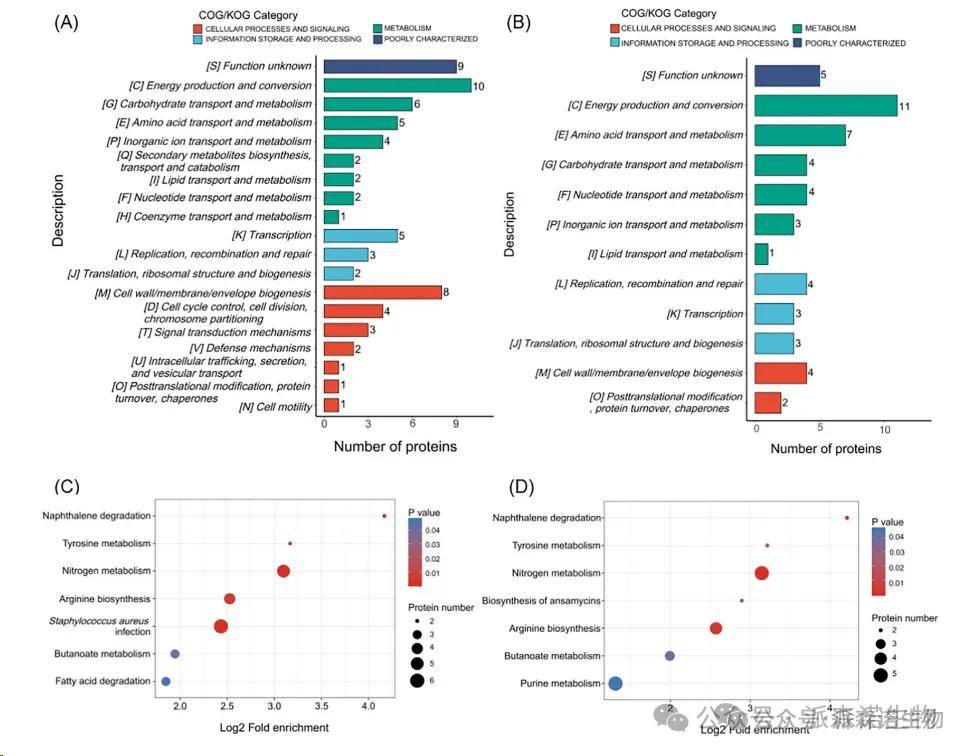 直系同源组(COG)分析的簇表明,DEP主要参与碳水化合物和氨基酸的能源生产和转化,运输和代谢,细胞壁/膜/包膜生物发生以及细胞分裂(图2A和B)。此外,KEGG途径富集分析表明,这些深度与以下途径有关:金黄色葡萄球菌感染;丙氨酸,天冬氨酸和谷氨酸代谢;氮代谢;精氨酸生物合成;酪氨酸代谢;丁烷新陈代谢;萘降解;脂肪酸降解和嘌呤代谢(图2C和D)。