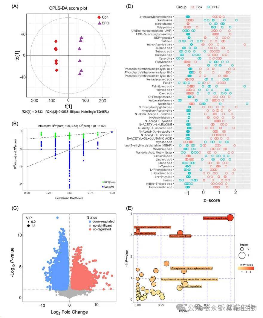 在本研究中,基于UPLC-QTOF/MS系统和多元统计分析的代谢组学方法用于分析用SFG或KE处理的MRSA细胞中代谢物光谱的扰动。根据OPLS-DA模型选择了分化的代谢物(DMS)。对照组和治疗组均表现出明确的聚集行为。每个组中的所有重复都分为相同的簇,证实了对照组和治疗组之间的代谢谱的差异(图3A和B,图S3A和B)。在SFG组中总共定义了192个显着改变的代谢产物,其中148种代谢产物被下调,44个代谢产物上调。在KE组中,鉴定出189个显着改变的代谢产物,其中132个代谢产物被下调,57个代谢产物上调(VIP> 1,p-value <0.05)(图3 C和D,图S3C和D,图S3C和D,图S4)。 KEGG富集分析表明,DMS主要参与氨基酸和脂肪酸代谢途径(图3E和图S3 E)。