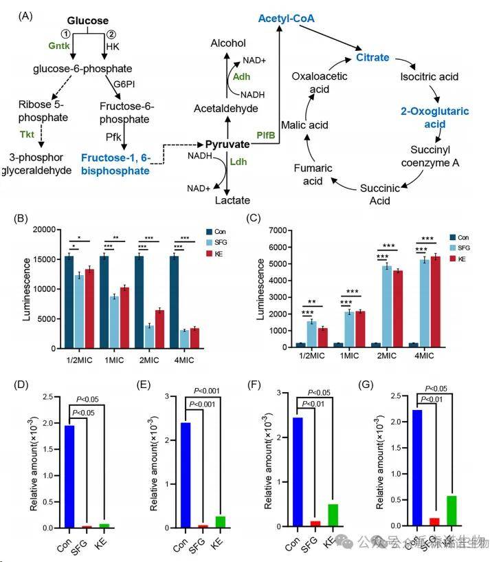 SFG和KE的生产可以减少MRSA和MRSP Embden-Meyerhof途径(EMP),并构成了MRIND和EMP。在SFG或KE的压力下,MRSA的膜渗透性发生了变化,导致ATP的大量泄漏,MRSA的能量代谢受到干扰,最终导致了细胞损伤和死亡。