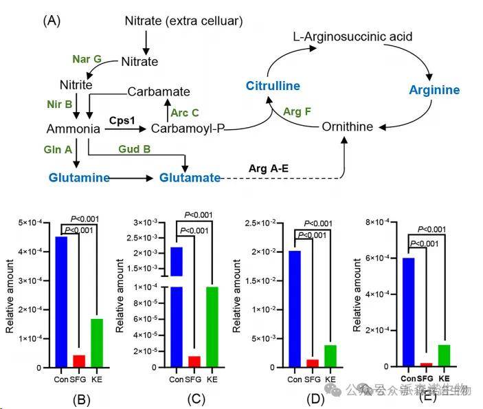 我们发现SFG和KE对MRSA的氮和氨基酸代谢具有重大影响。与硝酸盐还原至氨的关键催化酶NAR G和NIR B显着下调(P <0.01)。抑制此过程可能会降低细胞内氨水,这是谷氨酰胺和谷氨酸合成的关键成分。另外,抑制谷氨酸合成将进一步影响精氨酸合成。蛋白质组学的结果表明,谷氨酸脱氢酶(GUDB),谷氨酰胺合成酶(GLNA),氨基甲酸酯激酶(ARCC)和鸟氨酸碳氨甲酰胺型转移酶(ARGF)的表达显着下调(图7A,表S2和S3)。相应地,代谢组学结果显示,用SFG和KE处理的MRSA中谷氨酰胺,谷氨酸,瓜氨酸和精氨酸水平显着降低(图7B-E)(p <0.01)。总之,SFG和KE可能会干扰MRSA对硝酸盐的利用并抑制氨基酸的合成,从而导致MRSA能量代谢的破坏。