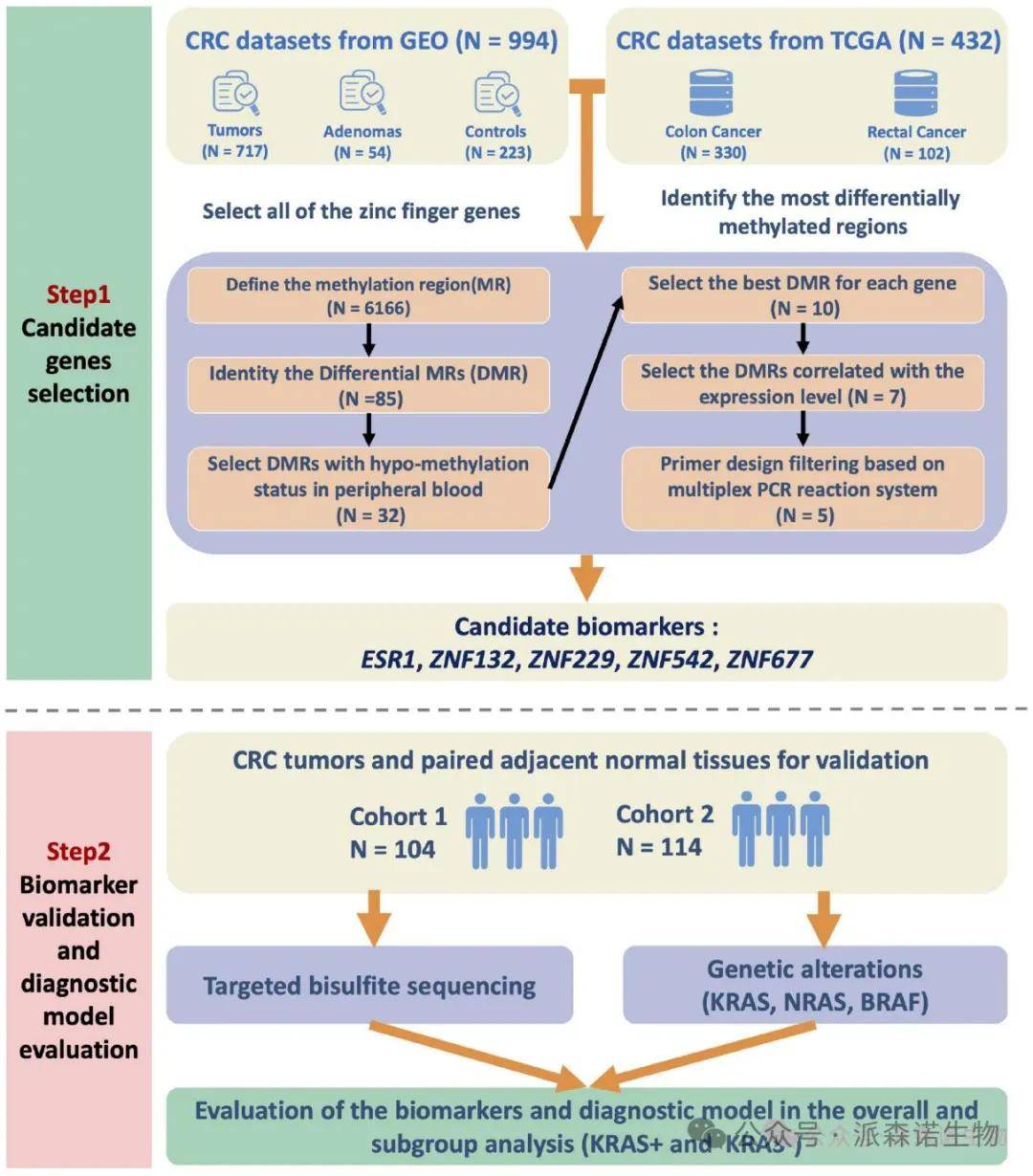 本研究首先收集了1426个全基因组DNA甲基化的公共样本,包括1104例 CRC肿瘤 ,54例腺瘤和268例癌旁细胞,联合锌指基因组数据进行甲基化差异分析;其次,采用TBS靶向甲基化测序技术在两组CRC患者中鉴定并验证差异甲基化程度最高的ZFGs;最后,比较ZFGs和SEPT9在所有CRC患者以及KRAS+和 KRAS-亚组中的诊断能力。