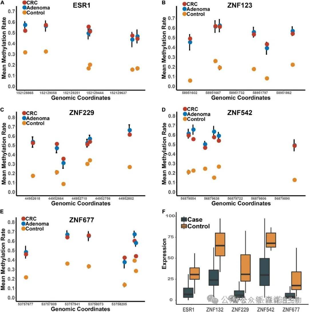 对数据库筛选出的1426个DNA甲基化样本进行滑动窗口法计算及差异甲基化分析鉴定,获得了5 个锌指家族候选基因:ESR1、ZNF132、ZNF229、ZNF542 和 ZNF677。验证结果显示,这五个基因在CRC和腺瘤组织中均表现为显著高甲基化,且与 TCGA 数据集中的癌旁组织相比,这些基因在CRC肿瘤中的表达水平也显著下调(图2)。