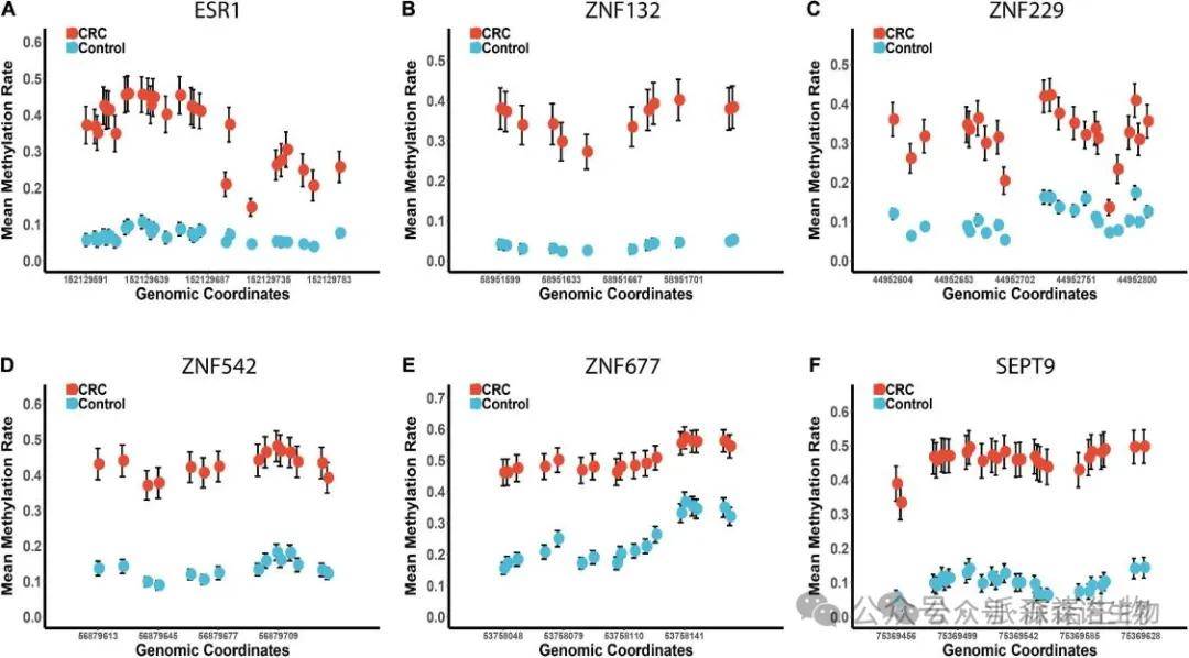 为筛选更稳定的结直肠癌(CRC)诊断候选基因,本研究整合了验证队列1和验证队列2的数据集。如图6所示,ZNF132的诊断能力(敏感性=0.83,特异性=0.97,AUC=0.93)显著优于其他基因,包括SEPT9(敏感性=0.83,特异性=0.87,AUC=0.91)。此外,ESR1的诊断能力(敏感性=0.78,特异性=0.97,AUC=0.91)与SEPT9相当,表明这两个基因在CRC液体活检中具有重要潜力。