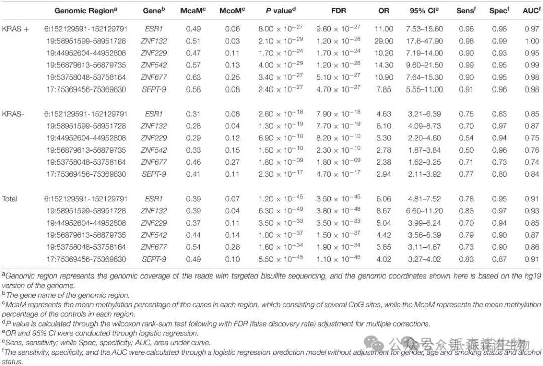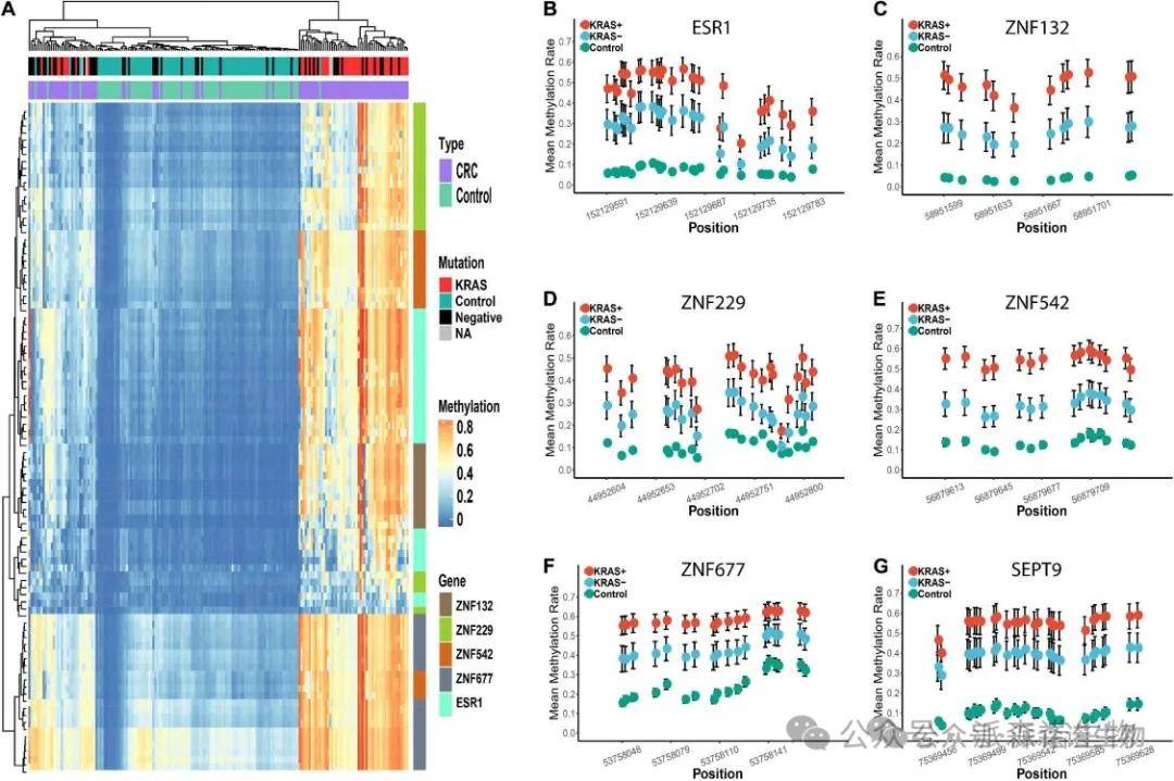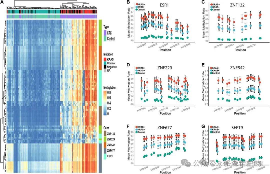 本研究共筛选出五个候选锌指基因(ZFGs):ESR1、ZNF132、ZNF229、ZNF542和ZNF677。其中ESR1和ZNF132对结直肠癌(CRC)的诊断能力与SEPT9相当或更优,表明这两种锌指基因可能在未来具有作为结直肠癌诊断生物标志物的潜力。此外,通过亚组分析发现,所有五种锌指基因在KRAS突变阳性患者(KRAS+)中的诊断能力均显著高于KRAS突变阴性患者(KRAS-),表明这些锌指基因可作为KRAS突变结直肠癌患者的理想诊断标志物。