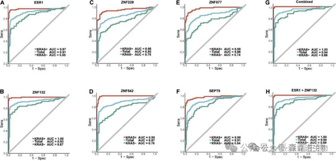 同时,我们利用全部样本评估了这些锌指基因(ZFGs)在KRAS突变型(KRAS+)和KRAS野生型(KRAS-)亚组中的诊断效能。结果显示,所有候选生物标志物在KRAS+组中均表现出更优的性能(表2)。