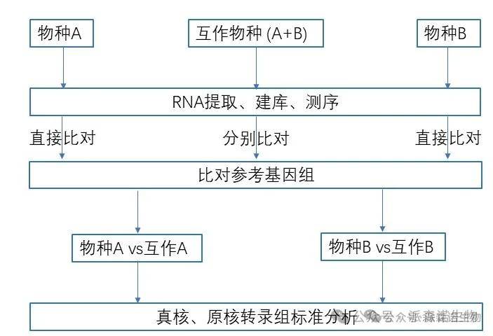 互作转录组实验基本设计思路是互作样本中的物种与各自物种的对照样本进行差异比较。互作转录组标准的样本构成为两个物种的对照样本以及互作样本。互作转录组对互作样本中的两个物种同时取样、提取RNA、建库、上机测序。最后获取两个物种RNA的测序结果并分别与这两个物种的对照组进行后续转录组分析。