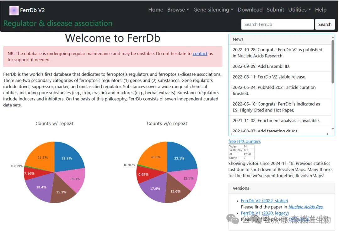 FerrDb是一个专门用于铁死亡(Ferroptosis)研究的数据库。由广州医科大学附属脑科医院、四川大学生命科学学院以及生物资源与生态环境教育部重点实验室的研究团队共同开发。铁死亡是一种依赖铁的细胞死亡形式,近年来在生物医学研究中备受关注。FerrDBV2是该数据库的最新版本,提供了丰富的铁死亡相关数据和功能。