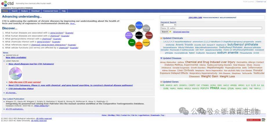 CTD数据库(Comparative Toxicogenomics Database)是一个集成了大量化学物质、基因、功能表型和疾病之间相互作用数据的资源库。CTD数据库的主要目的是帮助科研人员了解化学物质的毒性和与之相关的基因和疾病,为研究疾病相关的环境暴露因素和药物潜在作用机制提供了极大的便利。数据库目前更新至2021年版本,包含超过4664万条相互作用数据,涵盖了超过230万种化学物质、46689个基因、4340个表型和7212种疾病信息。