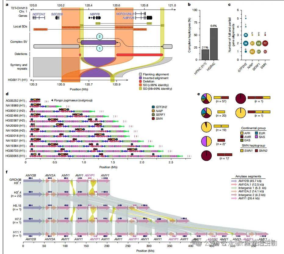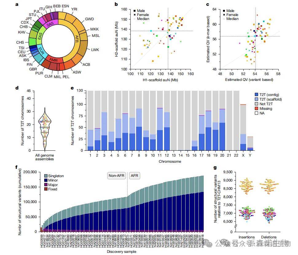 1.文章完成65个不同人群、130条近乎完整(T2T)的单倍型基因组组装,显著提升了结构变异检测精度,填补了着丝粒、MHC、SMN1/2等复杂区域的空白。