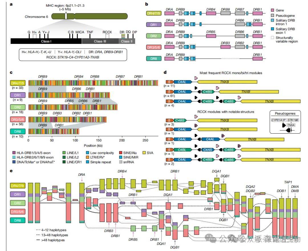 研究人员对主要组织相容性复合体(MHC)区域进行了全面分析,注释了130条单倍型中的HLA和非HLA基因,修正了826个不完整的HLA等位基因注释,并发现了170个新的结构变异。研究揭示了MHC II类单倍型(如DR8和DR1)的演化机制,解析了RCCX基因簇的复杂模块结构及其进化中的基因转换事件,同时开发了Locityper工具将等位基因预测准确率提升至97.1%。通过泛基因组分析不仅验证了传统HLA-DR分组系统,还发现了潜在的细分亚类,为疾病关联研究和精准医疗提供了重要资源。