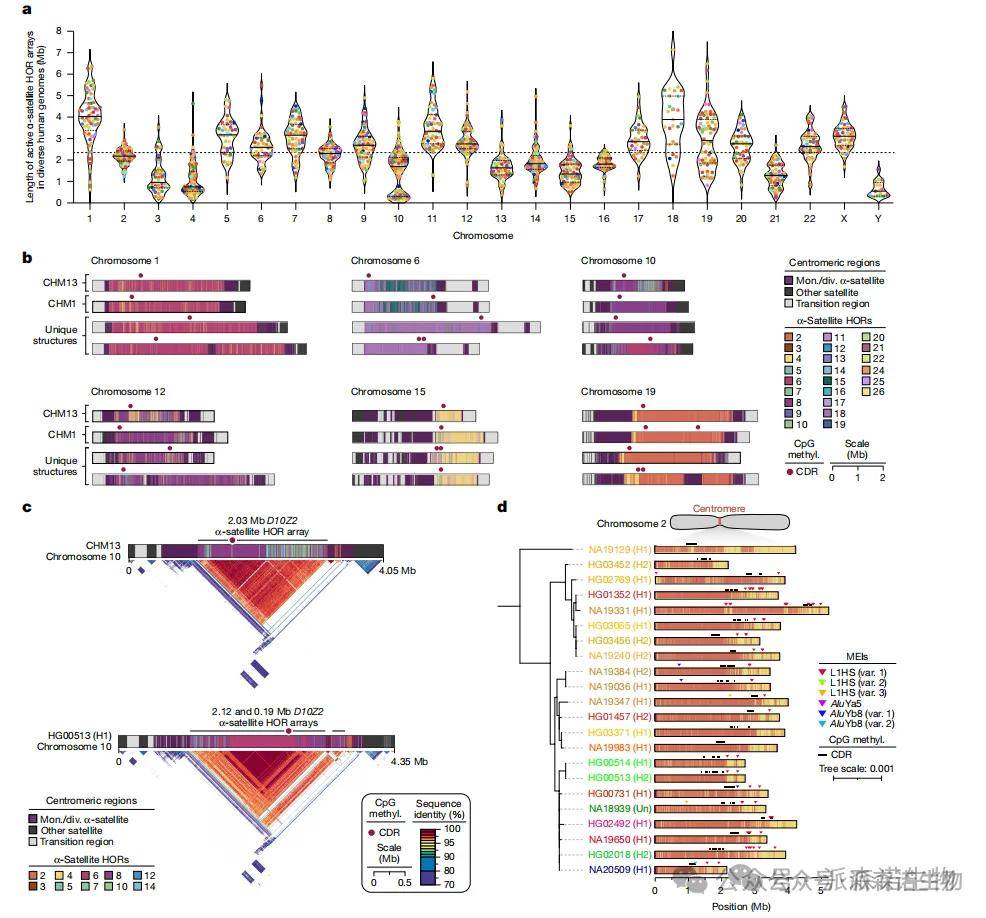 人类着丝粒是高度变异的基因组区域,由α-卫星DNA构成的高级重复单元(HORs)组成,长度和结构在不同个体间差异显著。研究人员利用Verkko和hifiasm两种算法,首次在65个基因组中高质量组装出1,246个完整着丝粒,平均每个基因组约19.5个。研究发现α-卫星阵列在长度上差异较大,并识别出4,153种新型HOR变体和阵列结构,部分染色体上出现阵列分裂现象。通过CpG甲基化分析,所有着丝粒均存在低甲基化区域(CDR),部分染色体呈现“双CDR”,提示可能存在双动粒结构。此外,约30%的α-卫星阵列中含有移动元件插入(MEI),主要为L1HS和Alu,大多分布在CDR之外。个别插入可能影响CDR结构,提示其在调控动粒定位和染色质结构中可能具有功能作用。
