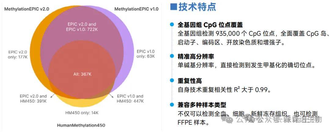 Infinium MethylationEPIC v2.0 BeadChip Kit(935K)是一种全基因组甲基化筛选工具,靶向人类甲基化组具有生物学意义的区域中超过 935,000 个 CpG 位点。该芯片保留了以单核苷酸分辨率定量分析全基因组CpG位点的能力,同时提供高度精准的甲基化检测,不受测序深度的影响。可使用Infinium 甲基化检测分析多种 DNA 样本类型,包括从 FFPE 分离的 DNA 样本,因此可用于探究疾病机制和生物标志物的筛选。