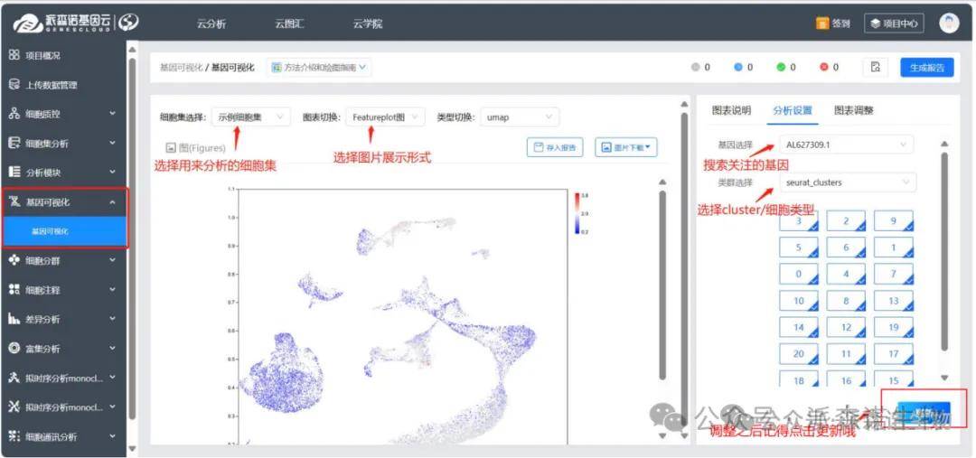 (1)①和②模块中的操作内容需要在模块③中进行查看和修改,以基因可视化的结果为例,查看方式如下: