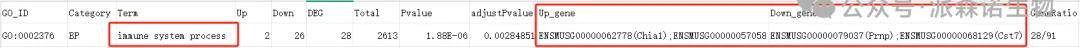 ①打开GO富集结果*_download_enrichment.xls文件,在Term列中,用关键词逐一筛选与您研究相关的生物学功能,通常认为pvalue小于0.05的Term达到了显著富集程度,可以重点关注。获得相关显著富集的GO Term后可以在同表格里看到注释到相关GO Term的所有差异基因信息,示例如下: