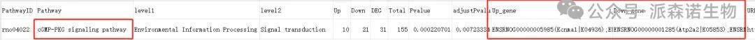 ②打开KEGG通路富集结果*_KEGG_download_enrichment.xls文件,在pathway列中,用关键词逐一筛选与您研究相关的通路,常认为pvalue小于0.05的通路达到了显著富集程度,可以重点关注。获取关注通路的富集情况后可以参照GO筛选方法,即可获得注释到关注通路的所有差异显著基因的信息。以查找“cGMP-PKG signaling pathway”为例,示例如下:
