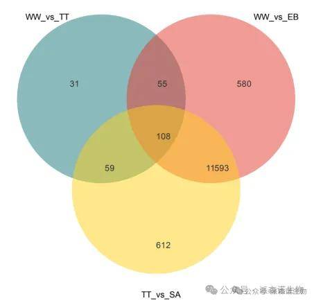 可以用韦恩图筛选不同比较组(不同基因集)共同的元素和特有元素,比如共同差异表达基因、特有差异表达基因等,并将这种筛选过程和结果可视化。灵活利用韦恩图可以通过一次筛选或多次筛选获取我们关注的核心基因集,然后可以对核心基因集进行进一步分析。比如利用韦恩图筛选某基因敲减组差异上调基因和过表达组差异下调基因的交集。