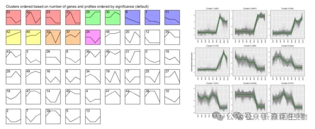当老师样本为不同时间节点、浓度梯度、治疗或用药前后的这种设置时,若进行两两比较筛选,当样本组较多时可能需要多次的相交筛选才能获得目标变化趋势的基因集。老师可以基于STEM(http://www.cs.cmu.edu/~jernst/stem/)的基因表达模式聚类分析或者常规趋势分析可以快速获得我们关注趋势的基因集或者哪种变化趋势是最显著的变化趋势。然后针对目标基因集进一步分析即可。