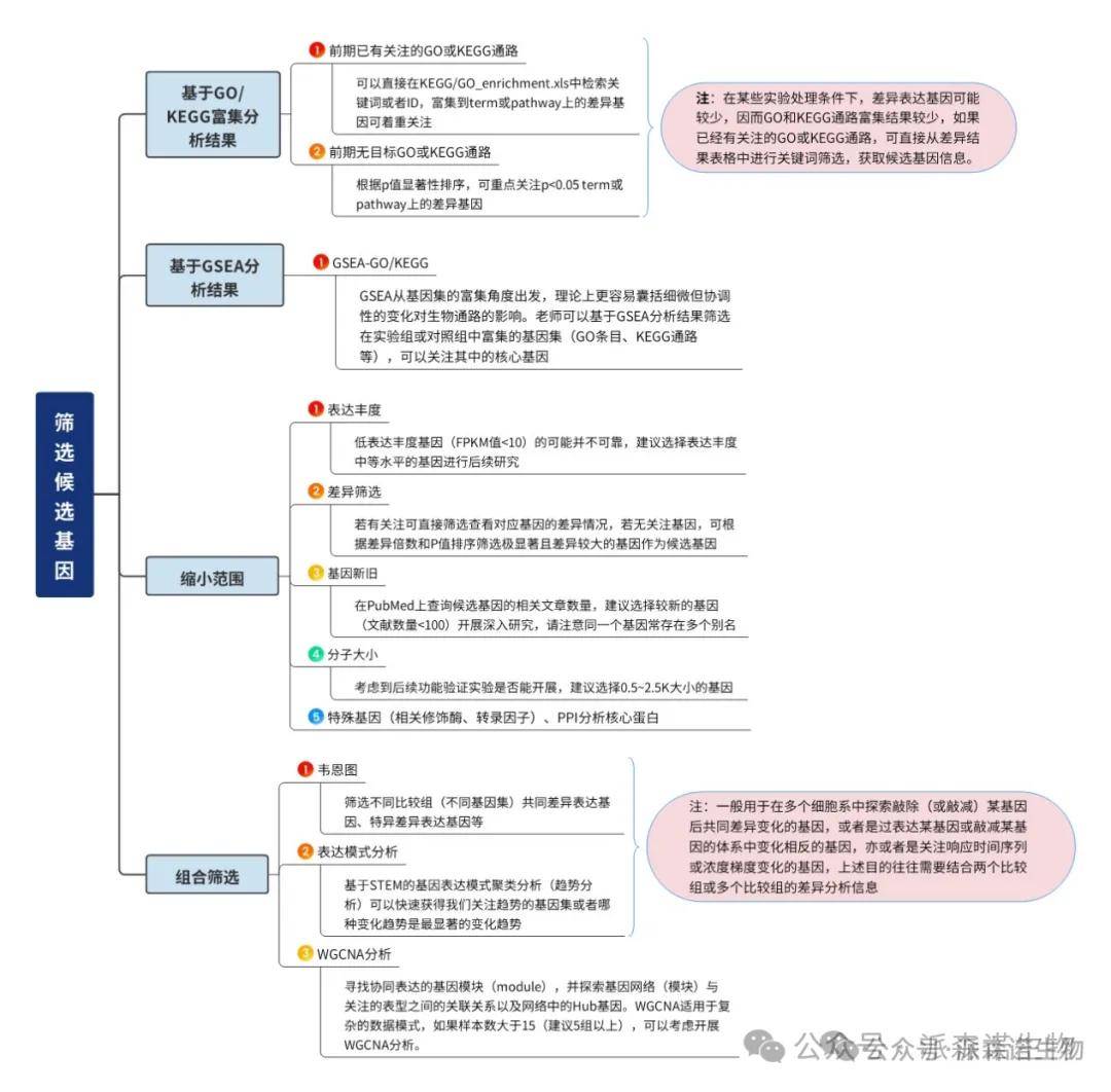 候选基因应该与老师所研究的生物学问题密切相关,并在某一生命过程中发挥核心的生物学功能、参与重要的通路。基因功能的背景信息可以来源于参考基因组注释、基因功能数据库(如GO、KEGG)注释或者相关研究的文献和综述等,获取可能相关的基因、GO和KEGG通路信息,然后在自己的测序结果中进行筛选。无论通过怎样的方式进行数据筛选,人为的解读和数据挖掘是必不可少的。