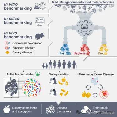 肠道微生物组、宿主和饮食的复杂相互作用是维持健康或引发疾病的关键。然而,传统研究方法(如宏基因组测序)主要关注微生物的基因组成,无法直接反映其功能活性。蛋白质作为生命活动的直接执行者,其表达水平更能体现微生物和宿主的动态功能状态。炎症性肠病(IBD)等肠道疾病与微生物组失调密切相关,但现有诊断标志物(如钙卫蛋白)敏感性和特异性有限,且缺乏对饮食暴露的客观评估方法。研究开发了一种结合宏基因组信息的宏蛋白质组学方法MIM(metagenome-informed metaproteomics),该方法能够同时量化来自饮食、宿主和微生物的蛋白质,以更好地解析宿主-微生物组-饮食相互作用,并为炎症性肠病(IBD)等肠道微生物组相关疾病的个性化诊疗开辟了新的可能性。