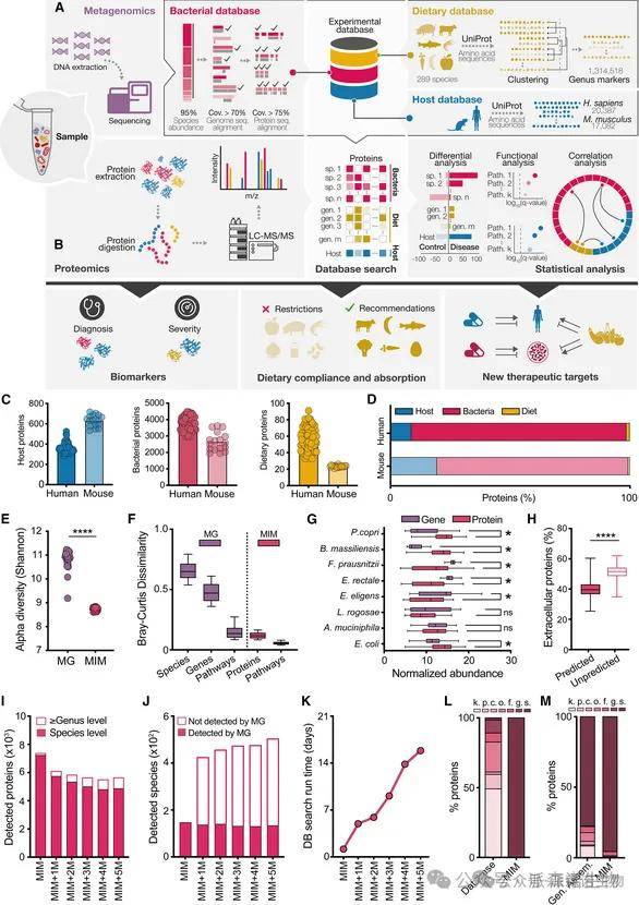 “宏基因组指导下的宏蛋白质组学”(Metagenome-Informed Metaproteomics,MIM)方法主要是利用每次实验样本的宏基因组测序结果构建个体化参考数据库,结合质谱进行蛋白质组检测和定量的分析方法,以此实现对宿主、肠道微生物及膳食来源蛋白的同步、种水平定量分析。简单说,就是先用宏基因组获得菌群信息,再用这些菌的基因信息做参考,结合质谱检测蛋白,这样就能精准知道粪便里宿主、细菌和吃进去的食物都有哪些蛋白被表达出来,从而分析它们之间的相互作用。在健康SPF小鼠中,MIM平均检测到631个宿主蛋白、2656个细菌蛋白和23个膳食蛋白;在人类样本中,分别为363、3746和58个。通过与其他宏蛋白质组学和宏基因组方法的体外、计算模拟及体内对比,MIM在灵敏度、特异性和分类精度上表现更优,能够识别>90%的已知细菌蛋白,且准确度高于97%。