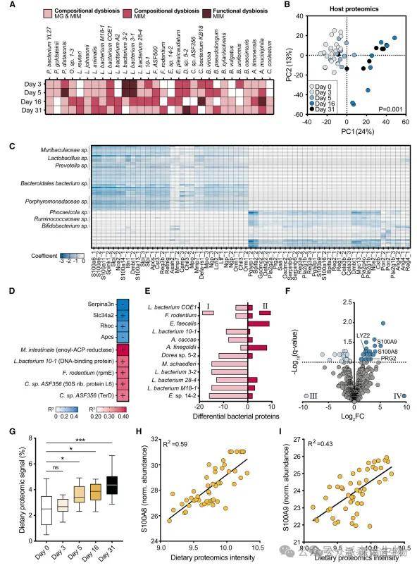 利用 MIM 来解析在诱导小鼠急性葡聚糖硫酸钠炎症性肠病(IBD)结肠炎模型过程中发生的复杂整体生物相互作用。在 DSS 补充开始后仅 3 天,并且在整个疾病过程中,无论是通过宏基因组还是 MIM 评估,粪便微生物组都与基线相比发生了显著变化。值得注意的是,MIM 识别出这种急性炎症环境中的两种不同的失调模式:一种是“组成性失调”,表现为共生菌丰度的变化,特征为物种特异性蛋白的单向表达变化。这些变化可以通过宏基因组检测到(粉色)或仅通过 MIM 检测到(红色)。此外,还观察到一种“功能性失调”,它表现为某些物种中一组蛋白质的变化,大多数“管家蛋白”和相关的宏基因组信号保持不变(深红色)。这种与小鼠肠道自体炎症相关的功能性失调,特别表现为多种细菌蛋白的减少,主要来自 毛螺菌属(Lachnospiraceae) 物种。
