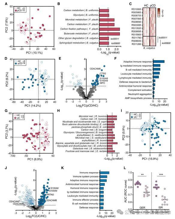 首先评估了以色列一组参与者的粪便MIM谱,这些参与者包括一组新发病的儿童克罗恩病患者(ISR-pCD,n = 26)和与其年龄及性别匹配的健康对照组(ISR-HC,n = 28)。ISR-pCD患者的粪便细菌MIM谱与ISR-HC组显著不同,其中包括多个细菌代谢途径的失调,这些途径在ISR-pCD患者中被发现发生了变化,例如普通拟杆菌(Bacteroides vulgatus)中的糖基降解和鞘氨醇脂代谢。有趣的是,几种细菌蛋白与临床参数显著相关,包括C反应蛋白(C-reactive protein, CRP)、钙卫蛋白和儿童克罗恩病活动指数(PCDAI)。此外,粪便中ISR-pCD宿主的MIM特征与ISR-HC组明显不同,并且与免疫系统,特别是中性粒细胞功能和细菌防御相关。