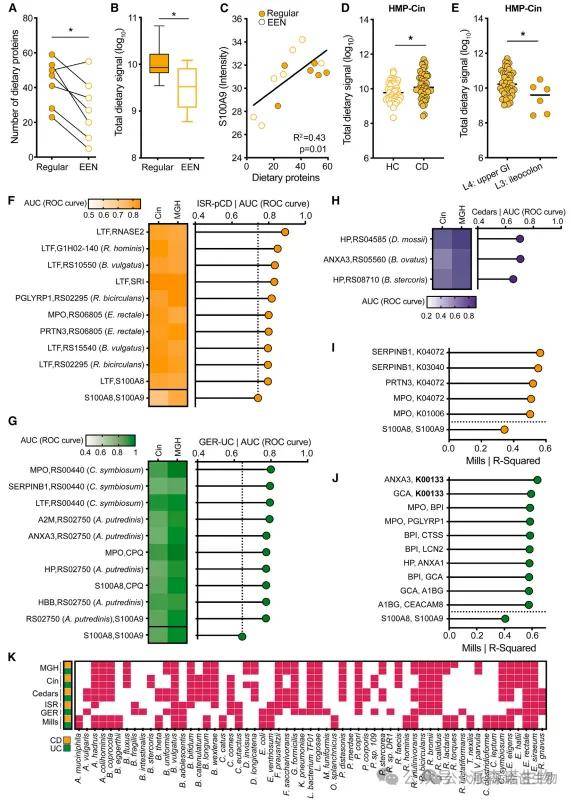在新发ISR-pCD患儿中,开始实施专一性肠内营养(EEN)后,粪便中膳食蛋白显著减少,个体间差异明显,且粪便膳食蛋白数量与炎症标志物S100A9呈正相关,表明MIM可同时评估饮食依从性与炎症状态。进一步分析HMP-Cin(Cincinnati Medical Center的 HMP队列)和HMP-MGH(Massachusetts General Hospital的HMP 队列)(人类微生物组计划(Human Microbiome Project, HMP)两个IBD队列,发现仅在HMP-Cin中,IBD患者粪便膳食蛋白总量显著升高,尤其是伴有上消化道受累的Crohn患者,提示MIM可作为非侵入性手段推测小肠吸收功能异常,具有潜在临床价值。