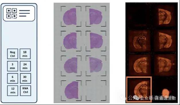 选择目标区域附近的组织切片,在普通玻片上进行固定和染色;采用不同的时间梯度,进行透化处理,6个透化梯度时间样本(官方推荐3/6/12/18/24/30 min),1个阴性对照,1个阳性对照;用带有荧光的核苷酸进行反转录合成cDNA。酶处理移除样本组织,然后对带有荧光标记的cDNA进行成像;对比H&E和荧光成像,选择荧光信号较强、mRNA弥散较小、内部组织结构清晰的时间点,作为正式实验透化时间点。