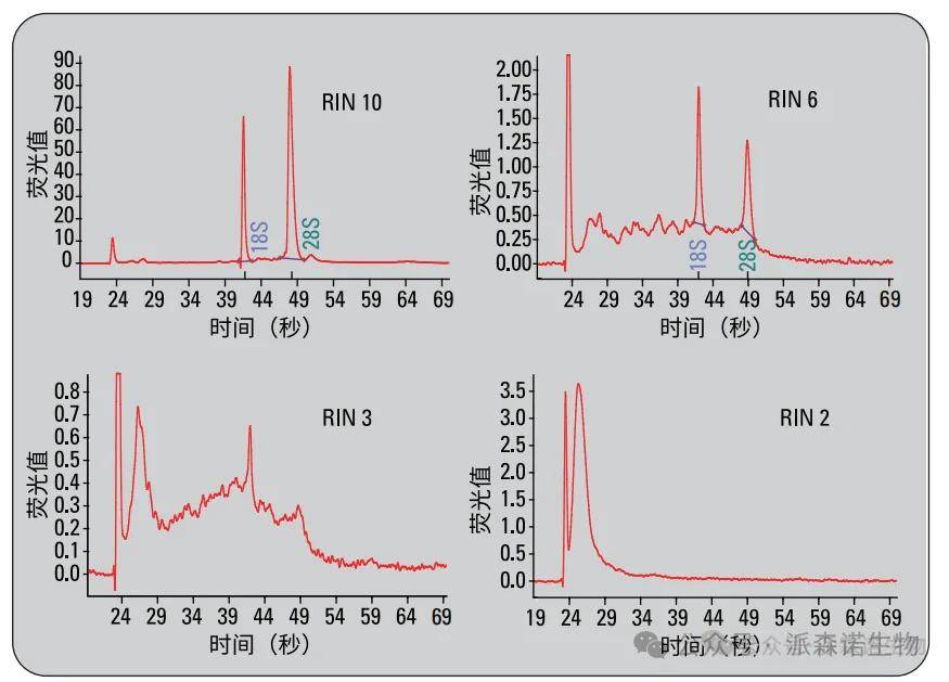 新鲜冷冻组织的 RNA 质量主要以 RIN 值衡量,该值通过 Agilent 2100 生物分析仪基于电泳图对真核总 RNA 质量分类,范围 1-10,1 代表降解严重、10 代表完整性高。