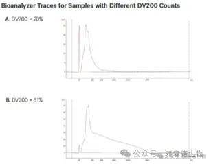 石蜡包埋(FFPE)组织是生物学尤其是医学领域常见的组织保存形式,但该方式会导致DNA/RNA 降解,mRNA的polyA尾断裂,故采用DV200 进行检测,DV200指超过 200 个核苷酸RNA片段百分比,其值越高,RNA完整度及与空间探针的结合概率越高。