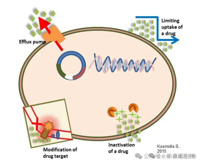 通过改变药物作用靶点的结构或表达,使药物无法有效结合。主要包括细胞壁合成靶点改变、核糖体靶点修饰、核酸合成靶点改变、代谢途径靶点改变
