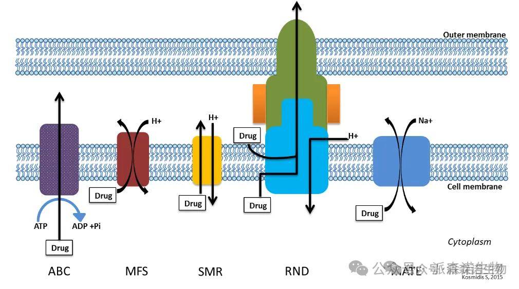 细菌通过跨膜泵将药物排出细胞,降低胞内浓度。主要包括以下五个家族: