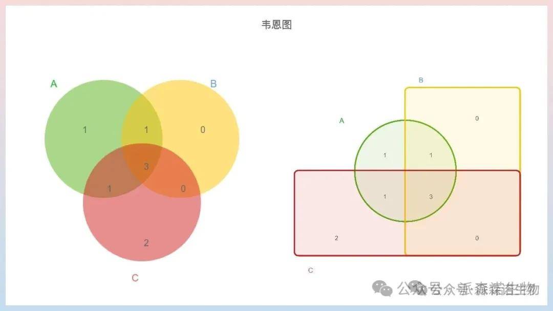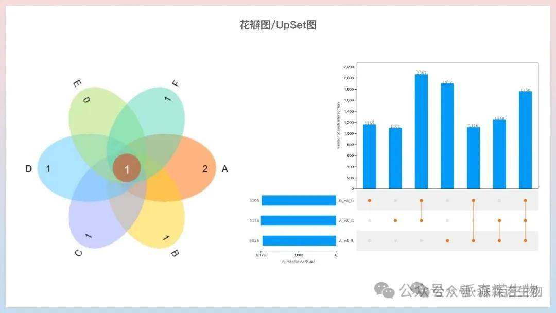 花瓣图:适用于5个以上数据集的交集关系,中心区域显示所有集合共有的元素数量,外围花瓣代表各样本独有的元素数量。