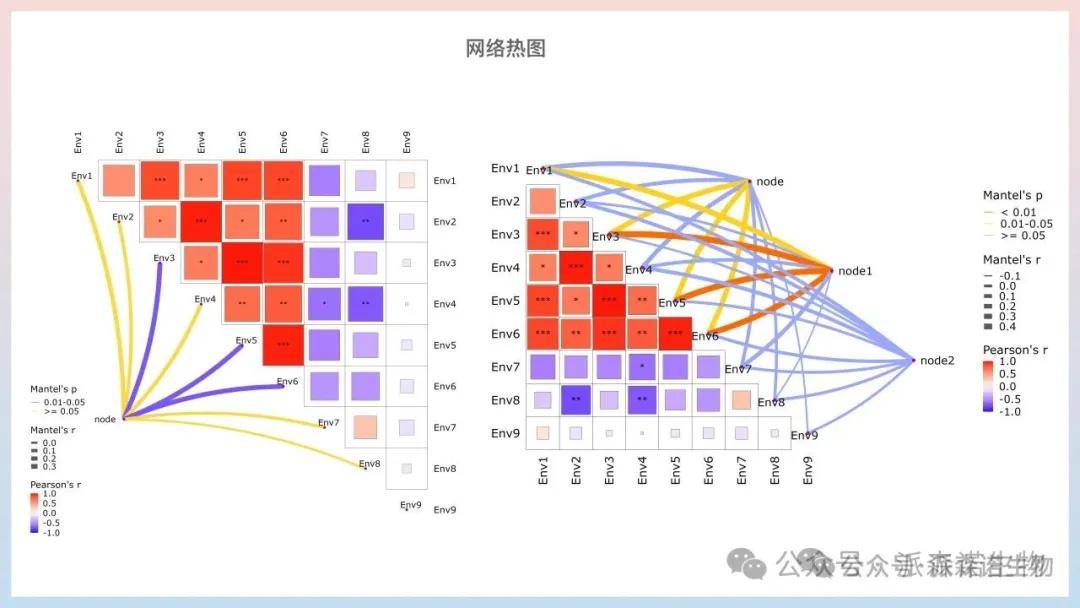 由热图和网络图组成,其中热图可展示组学内的相关性,而网络图可展示组学间的关联性