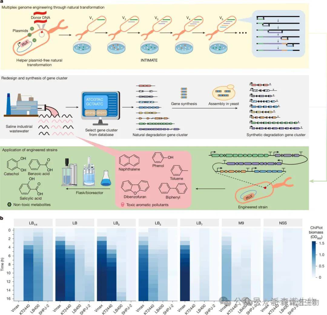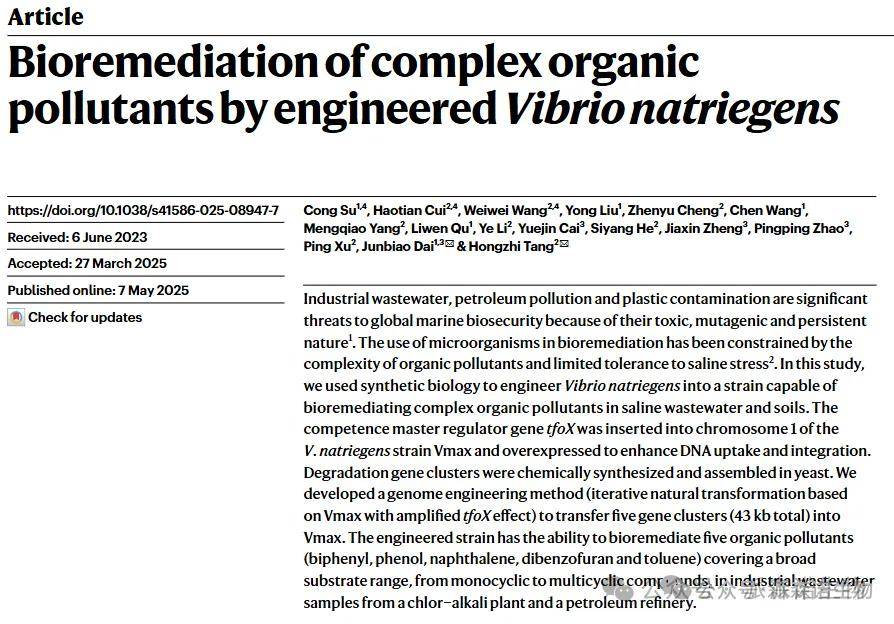 为了解决微生物的生物修复受限难题,亟需建立一株能够修复一系列污染物的菌株。研究团队筛选出需钠弧菌作为底盘菌株,其在30-50g/L盐浓度下生物量和污染物耐受性更高,转录组分析发现其外排泵及ABC转运蛋白基因在污染物压力下上调,增强排毒能力。通过整合tfoX基因构建VCOD-2,转化效率提升且无抗性标记残留。选定chr2_297为最优插入位点,构建的VCOD-3至VCOD-11中,5个菌株具降解能力。开发INTIMATE技术构建的VCOD-15,48小时内对5种污染物去除率超60%,在高盐废水和土壤中表现稳定,能高效降解污染物,且插入基因簇不影响生长,遗传稳定。这些成果为应对全球海洋生物安全威胁提供了新的技术手段,在处理工业废水、石油污染和塑料污染等领域具有重要的应用潜力。