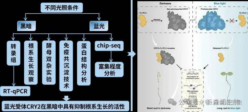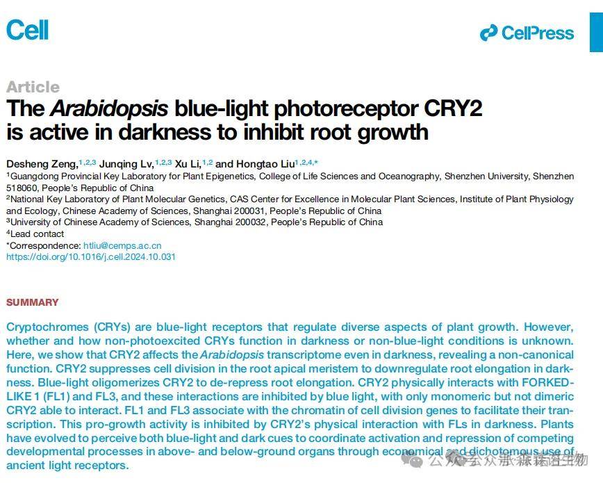 隐花色素(CRYs)作为一类蓝光受体,但非光激发状态的CRYs在黑暗或非蓝光环境中的作用及其机制仍不清晰。通过转录组分析,研究团队发现CRY2在黑暗中对基因表达的影响强于蓝光下,且参与多种生物过程。表型分析显示,黑暗中CRY2通过抑制根尖分生区细胞分裂及相关基因表达,抑制根伸长,蓝光可减弱该作用。进一步研究发现,CRY2在黑暗中与FL1、FL3发生物理相互作用(蓝光会抑制该作用),且FLs在蓝光下通过促进细胞分裂基因转录促进根伸长。遗传互作实验表明FLs在CRY2下游发挥作用,CRY2在黑暗中抑制FLs与细胞分裂基因染色质的结合,蓝光下该抑制解除,从而协调根系生长。