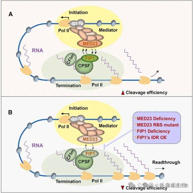 中介体复合物(Mediator complex)除了在转录起始中的作用外,还参与协调转录延伸和mRNA剪接过程。本研究揭示了中介体复合物通过MED23-FIP1的相互作用调控转录终止的分子机制。研究团队发现,中介体复合物通过MED23与前体mRNA 3'端加工复合体CPSF中的FIP1结合,这种相互作用不依赖于RNA或DNA,且可能通过相分离实现。MED23是一种RNA结合蛋白,具有两个RNA结合结构域,能特异性结合含CU-rich基序的3' mRNA。MED23或FIP1的缺失,以及FIP1特定片段的过表达,会破坏中介体与CPSF的关联,导致转录通读和融合转录本的产生,而MED23的RNA结合能力对此调控至关重要。此外,MED23在多种癌症中表达降低,其缺失与乳腺癌中的转录通读相关,可能影响癌症进展和患者生存,为癌症发生机制及潜在治疗靶点提供了新见解。