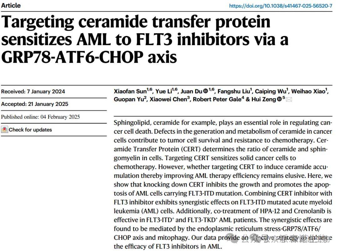 靶向神经酰胺转移蛋白通过GRP78-ATF6-CHOP轴增强AML对FLT3抑制剂的敏感性