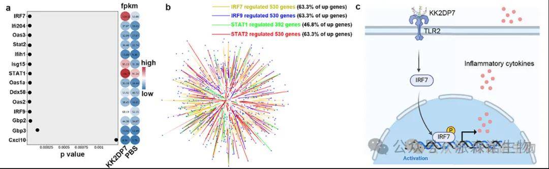 树状肽KK2DP7作为免疫调节肽衍生物,被选作模型佐剂以探索其通过训练免疫增强抗肿瘤效应的机制。研究团队发现,KK2DP7可通过诱导训练免疫发挥抗肿瘤作用。在小鼠模型中,KK2DP7能显著延缓肿瘤生长,延长生存期,且效果与已知训练免疫激动剂β-葡聚糖相当,对多种肿瘤有效且无明显毒副作用。研究证实,其作用依赖于脾脏,脾切除后抗肿瘤效果消失。进一步发现,脾脏非淋巴区的CD11b⁺细胞是关键靶标,该细胞经KK2DP7训练后,会分泌特征性细胞因子,且增殖、吞噬和杀肿瘤能力增强,过继转移给naive小鼠可传递抗肿瘤能力。机制上,KK2DP7通过激活TLR2-IRF7轴,引发CD11b⁺细胞表观遗传重编程。