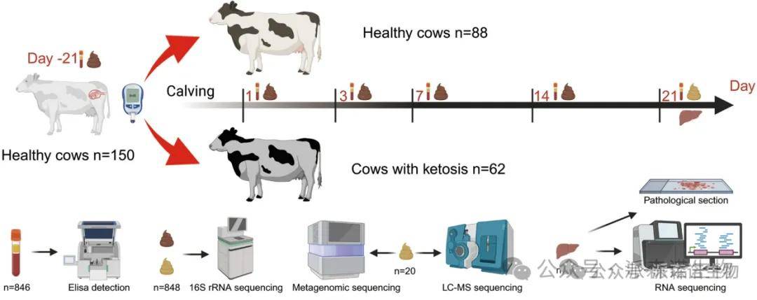 本研究以奶牛为模型,探究后肠微生物群稳态破坏对奶用反刍动物产后能量代谢紊乱的影响及机制。研究团队将88头健康奶牛与62头酮病奶牛作为对比,通过多组学分析和体外实验发现:酮病奶牛存在代谢紊乱,表现为血液中β-羟基丁酸等指标异常及肝脂肪变性。其粪便微生物群与健康奶牛差异显著,基于后肠微生物群的随机森林模型可较准确预测产后酮病(AUC=0.741)。宏基因组与代谢组学分析显示,健康组中Faecousia等菌属丰度高,可调节肠道乙酸浓度;酮病组中Methanosphaera等菌属占优。乙酸通过肝脏AMPK-PPARA轴抑制脂肪沉积并减少β-羟基丁酸生成,而酮病奶牛后肠乙酸缺乏。