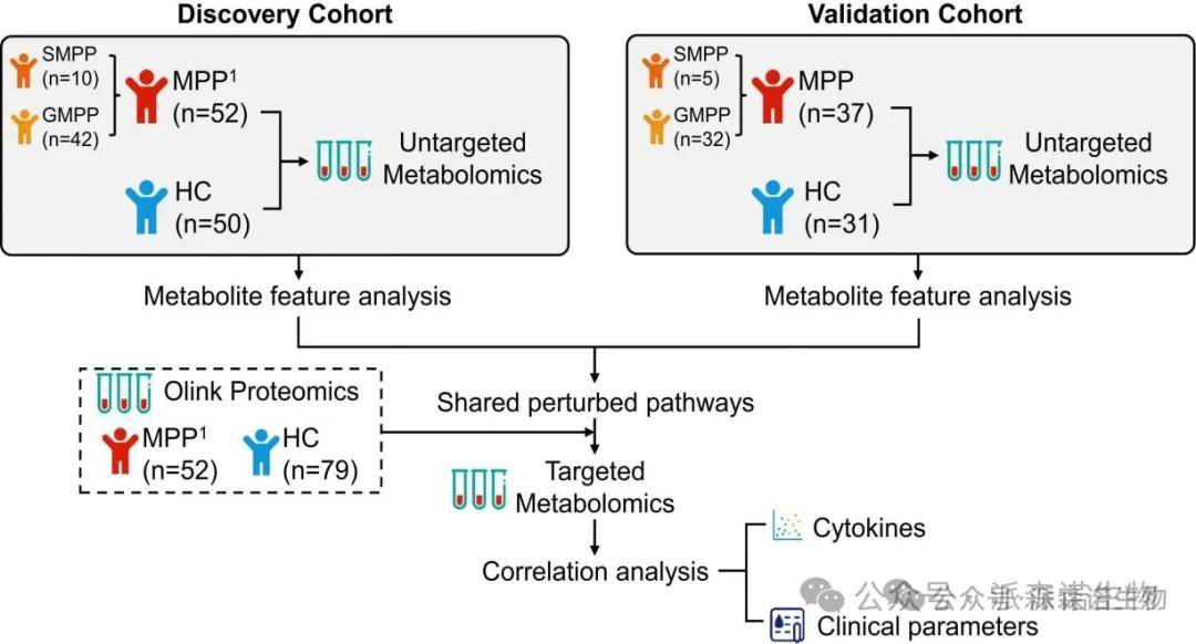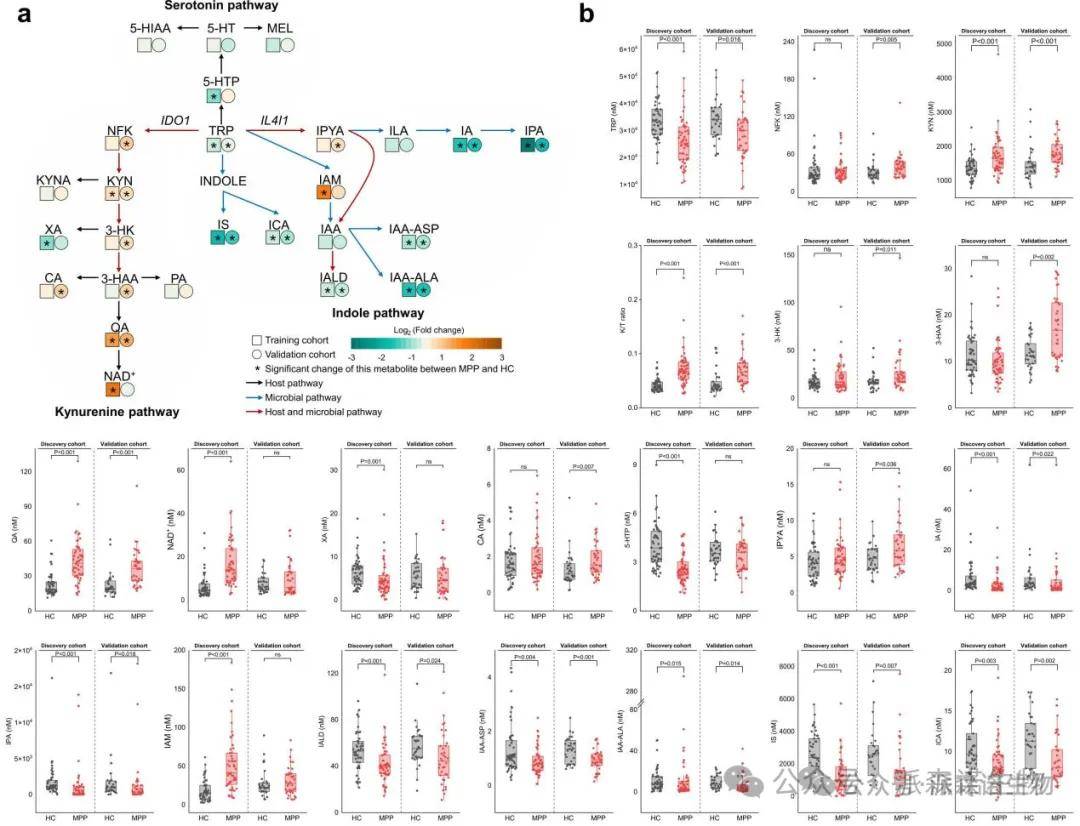 本研究采用两大独立队列,结合非靶向代谢组学、Olink蛋白质组学和靶向代谢组学,重点解析TRP代谢通路。结果揭示MPP中TRP代谢的双向调控特征:犬尿喹啉(KYN)通路上调促进炎症,而吲哚通路下调削弱抗炎作用。研究提示靶向TRP代谢的治疗潜力,并为免疫调节研究提供新方向。