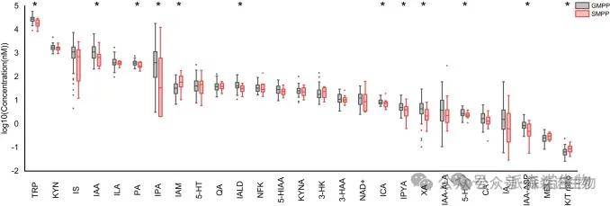 2.靶向代谢组学在两个队列中分析验证了色氨酸代谢的重编程,表现为色氨酸水平降低、犬尿喹啉代谢物增加以及吲哚衍生物减少。